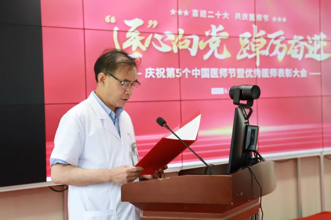 19日下午,我院在四楼学术会议厅开展医师节表彰大会,杨旭副院长致开场词,代表院领导班子及全体成员向兢兢业业、奋战在临床一线的全体医师们,致以最诚挚的问候!向全体医务工作者们表示最衷心的感谢和最崇高的敬意!向长期关心支持医院工作的全体医师家属们表示由衷的感谢!2022年以来,我院医务工作者“医”心向党、无惧风险,日夜奋战在我县及省内、外抗疫一线,同心抗疫,共同守“沪”,用实际行动诠释伟大的抗疫精神。全力践行“心肠好、服务好、医生好、设备好、环境好”的办医理念,以患者需求为导向,坚持仁心仁术,追求精湛的核心价值观。不忘初心,牢记使命,继续投身新时代的健康事业。最后,再次衷心祝愿各位医师节日快乐!祝你们身体健康、工作顺利、阖家幸福!